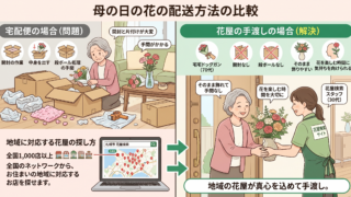 母の日の花を千葉県で用意するなら、受け取るお母さまの負担まで考えて選びたいものです。とくに花屋による手渡し配送は、宅配便の箱配送とは違い、届いてすぐに飾りやすく、開封や段ボール処理の手間を減らしやすいのが大きな魅力です。