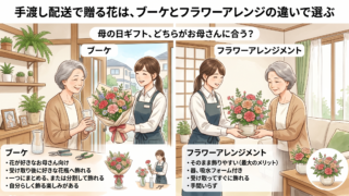 配送方法を決めたあとに考えたいのが、花のスタイルです。母の日ではブーケとフラワーアレンジのどちらも人気ですが、違いを知っておくと、お母さまに合う贈り方を選びやすくなります。